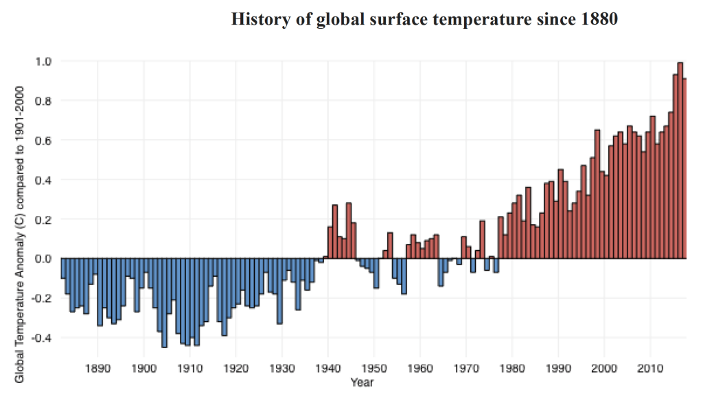 Yes. The average temperature on the planet has risen more than 1.5 degrees Fahrenheit (0.9 degrees Celsius) since the late 1800s, with most of the increase occurring more recently. Scientists measure temperature in thousands of locations around the globe to track air, surface, and ocean temperatures. You can read about how they currently calculate the Earth’s average temperature, as well as the history of the measurements here at the Earth Science Division of NASA’s Goddard Institute for Space Studies. Also, here is a climate data primer from the National Oceanic and Atmospheric Association. As you explore data and hear reports of the temperature, be sure to note if they are measuring temperature in Celsius or Fahrenheit. The figure below shows temperature anomalies (in degrees Celsius) over time (since 1880) — that is, differences from the 1901-2000 average global temperature (see the description on the Y-axis, the vertical axis, the one that goes up and down).