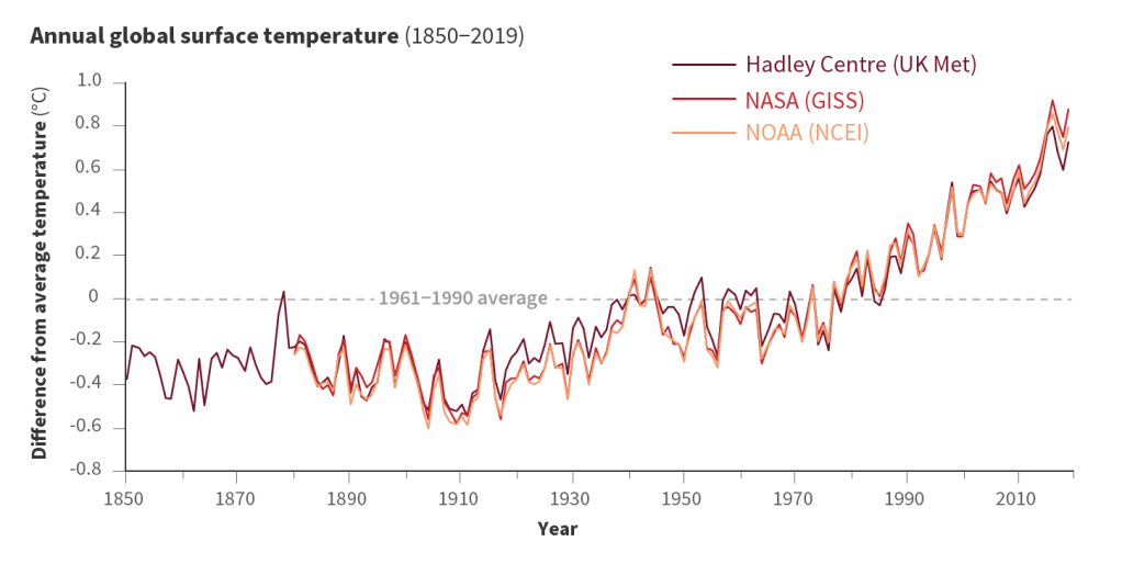 Below is another figure showing similar trends with a slightly longer history, a slightly different average line, and analysis by three independent groups of researchers (from the US Academy of Sciences, Climate Change: Evidence and Causes, 2020 Update: