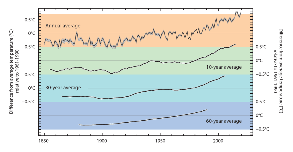 The figure below from the National Academy of Science illustrates the differences in how data is averaged. The top line is jagged and each data point represents the average for an individual year (smoothing our monthly variability). The next line, in the green band, is ten-year running averages. So, each data point represents the average temperature of the five years before and the five years after that date. The line becomes smoother and makes some of the longer trends clearer. The last two lines in the blue and purple bands do the same as the ten-year average but for 30- and 60-year averages, further smoothing the line but maintaining the trend.