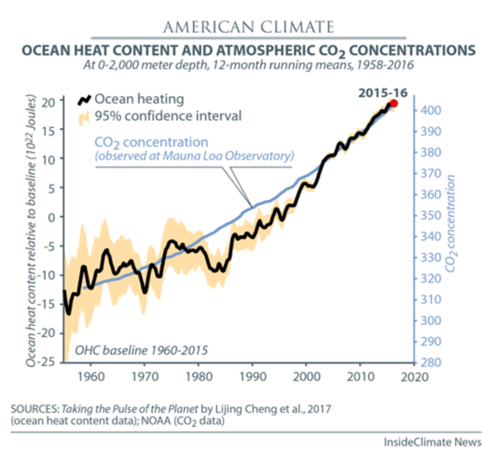 The rise in ocean surface temperatures also corresponds to the increase in atmospheric CO2 and other GHG emissions (see below). In the figure below, the black line is the change in ocean temperatures relative to the average across 1960-2015. The trend is one that clearly shows the warming of the ocean. The yellowish band represents the 95% confidence level of the statistical analysis. The wider the band, the greater the range of values around the black line that could occur without being attributed to a statistical anomaly. Since 2000, the yellow band narrows around the black line to the point where is virtually not visible. This means that scientists are increasingly confident that the measures are highly accurate. The blue line represents the levels of atmospheric concentrations of CO2 as measured at the Mauna Loa Observatory (see more below).