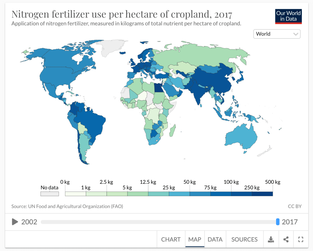 The map below shows the varied rate of nitrogen fertilizers used per hectare in nations around the world in 2017. The darker the blue, the higher the rate of fertilizer use per hectare (~2.5 acres).