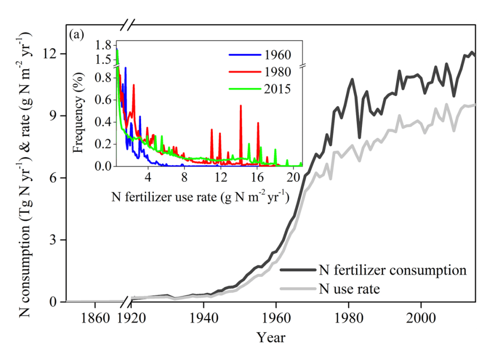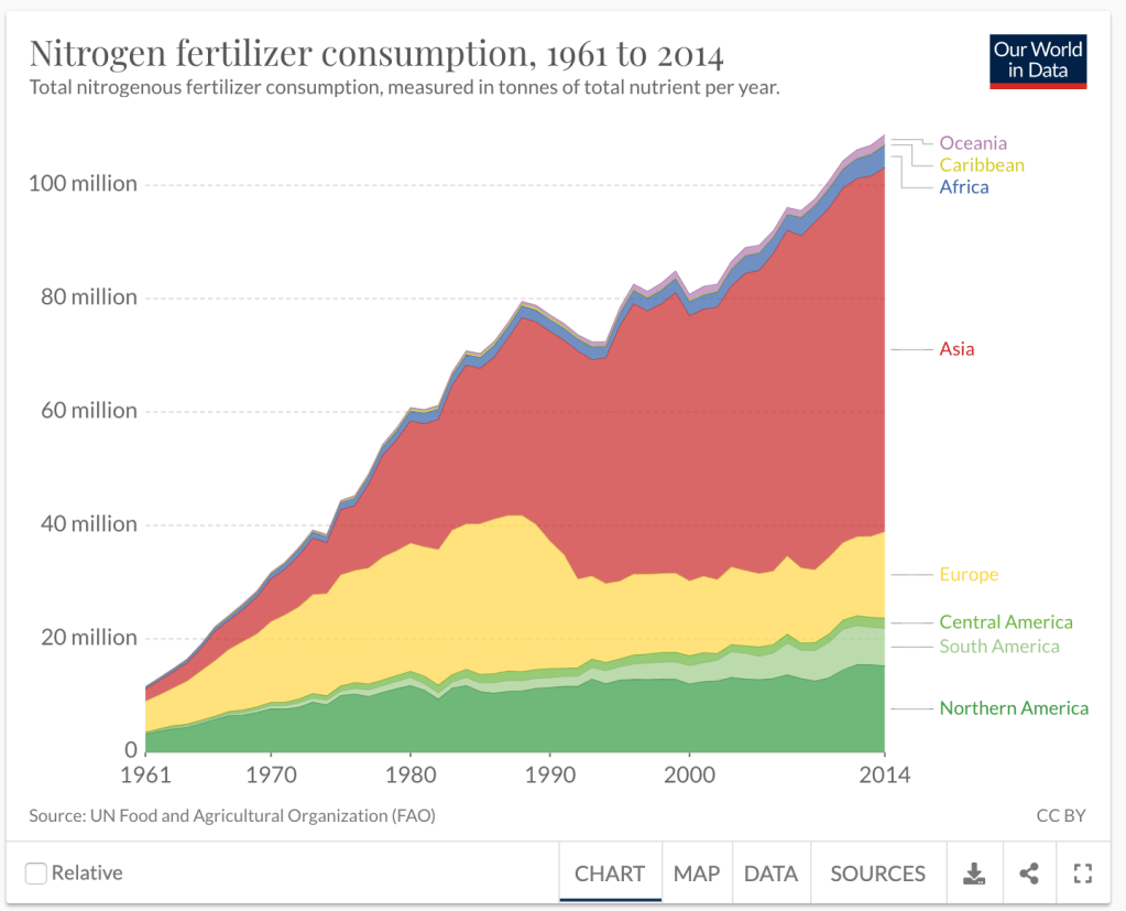 The figure below shows that increased rate of nitrogen fertilizer consumption over time by region. Remember that geographic regions are one unit of measure and they don’t account for different population sizes, levels of development, or measure equivalent areas of land.