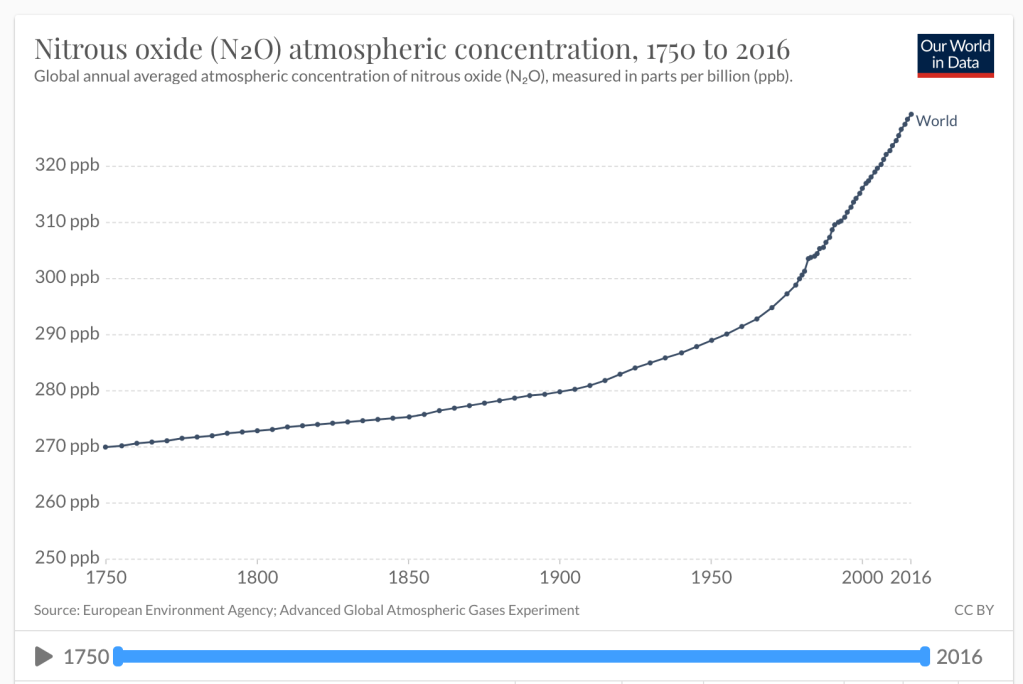 Nitrous oxide (N2O) is the third most prevalent of the anthropogenic greenhouse gases (GHGs) making up 6% of global emissions. [Note that this is NOT nitrogen dioxide (NO2)] Nitrous oxide has ~298 times the heat trapping power of carbon dioxide. In other words, one kilogram of nitrous oxide released into the atmosphere has the warming equivalent of 298 kgs of CO2.