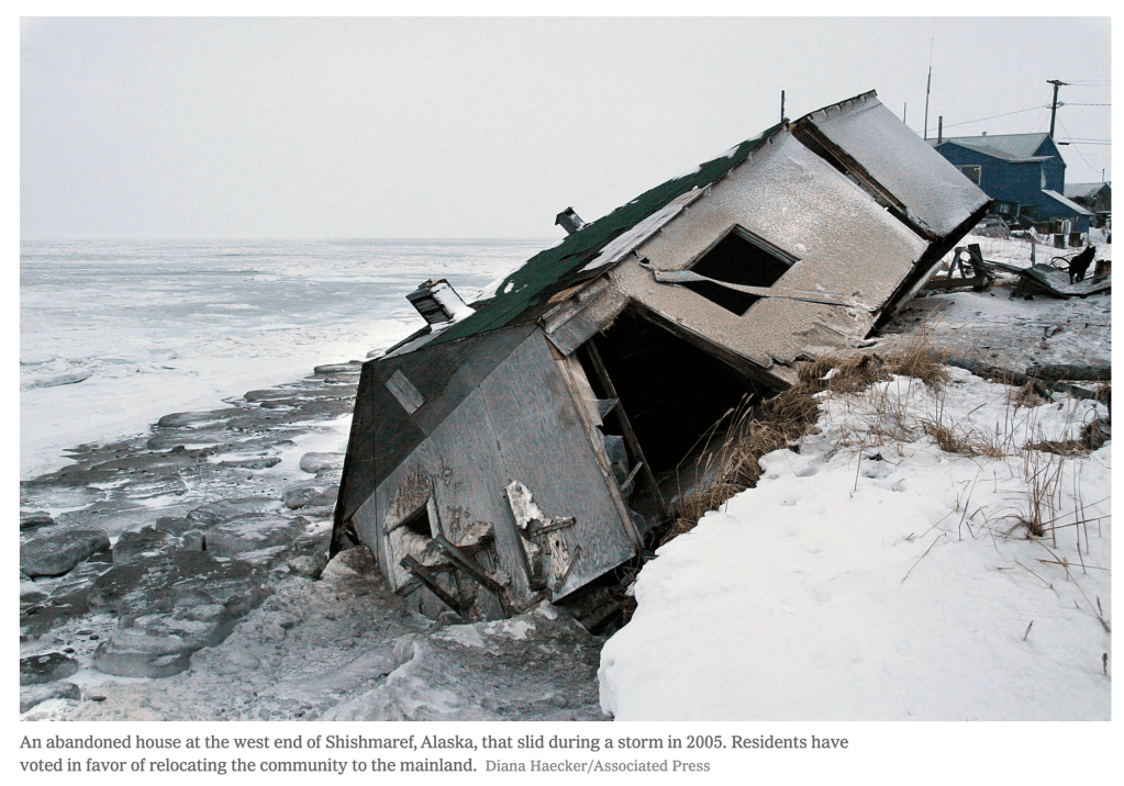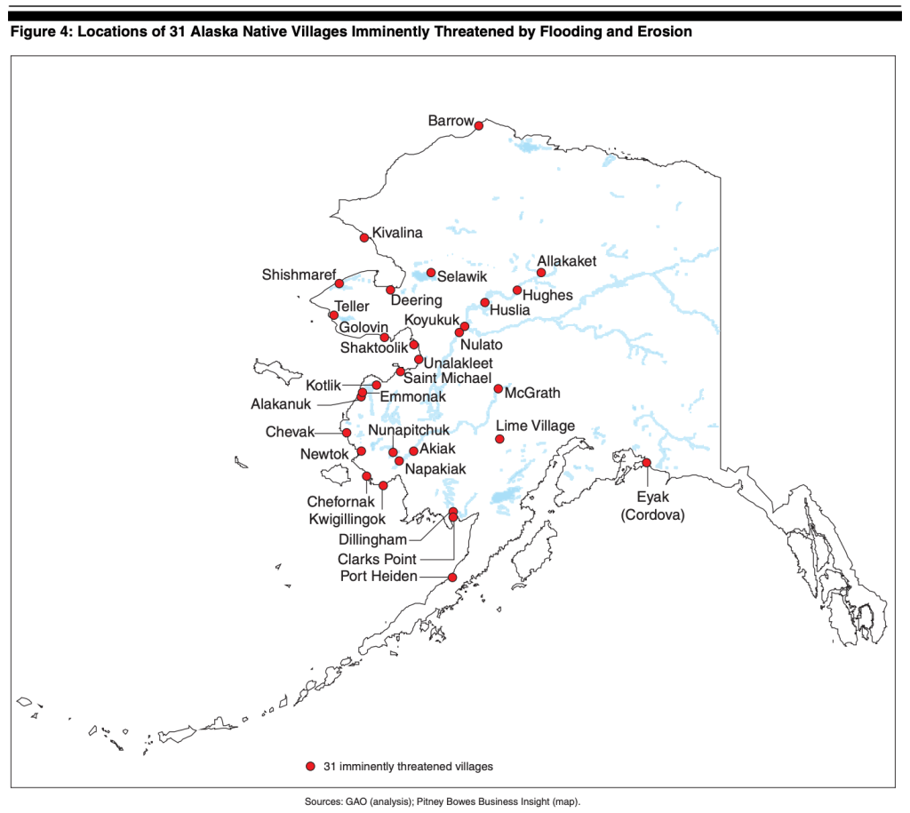 Additionally, decreasing and later-forming sea-ice made it difficult for the community to sustain their traditional hunting and fishing practices that got them through the Alaskan winters. The community is made up of about 650 members of the Inupiat Inuit tribe. Just in Alaska, there are another 30 communities that have been identified that face the imminent threat of flooding and erosion (see the map below from the US Government Accountability Office). The film, The Last Days of Shishmaref, documents the community’s struggle (trailer).