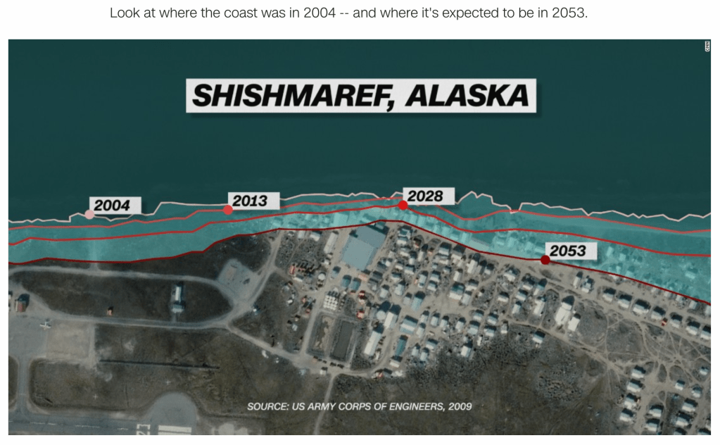 In 2002, the Alaskan village of Shishmaref (originally named Kigiktaq), on quarter-mile-wide Sarichef Island in the Bering Strait of Alaska, voted to relocate inland after thawing permafrost (see research on global trends here) and decreasing winter sea ice allowed powerful winter waves to dramatically erode away the coast line. The image below, pulled from CNN and sourced from the US Army Corps of Engineers, shows the past and projected erosion of the community’s coast.