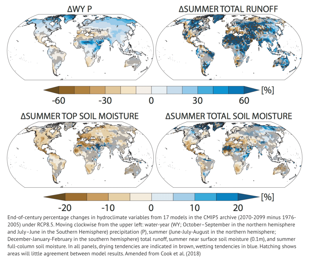 Naumann and co-authors put it matter of factly in the abstract of their 2018 research, “the magnitude of droughts is likely to double in 30% of the global landmass under stringent mitigation policies. If global warming continues at the present rate, water supply-demand deficits would increase fivefold while current 1-in-100-year droughts would occur every two to five years for most of Africa, Australia, southern Europe, southern and central United States, Central America, the Caribbean, north-west China, and parts of Southern America. Approximately two thirds of the global population will experience a progressive increase in drought hazard with warming. In drying areas, drought durations are projected to rise rapidly with warming.”