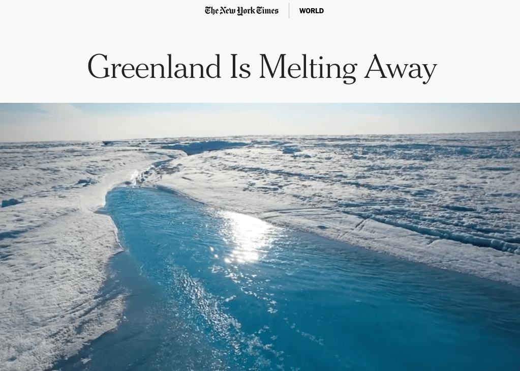 The GREENLAND ice sheet is of particular concern for its potential contribution to rising sea levels. Scientists predict that there is a high likelihood that, under most current temperature scenarios, the Greenland ice sheet will melt and contribute to a 7 meter (23 feet!) rise in sea levels. While this is a catastrophic rise in seas for society as we know it today, current projections argue that this will occur over the next thousand years. In the meantime, the ice sheet is melting at a increasingly rapid rate, now losing 393 Gt of ice per year, up from just over 100 Gt per year as recently as 2003 (source). Others argue that the rate of future melting may be faster than is currently predicted. Scientists recently discovered that an unusually persistent low-pressure system contributed to the record melting of the Greenland ice sheet in 2012 and 2019. In 2019, the ice sheet lost volume equivalent to 80 million Olympic-sized swimming pools.