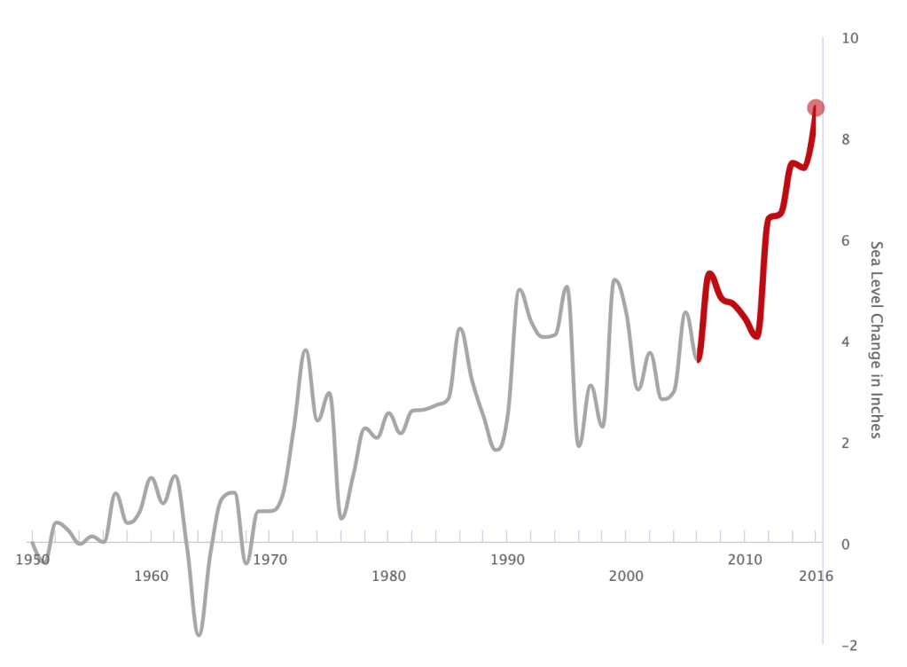 Several communities in the US are already dealing with the impacts of rising sea levels caused by anthropogenic climate change. Below, I explore three of the most dramatic cases: Miami, coastal Alaskan communities, and low-lying Louisiana communities. In Miami, scientists predict that by 2060, sea level will rise 14 to 34 inches above the 1992 average sea level. Measures indicate that it is already more than 8 inches higher than it was in 1950.