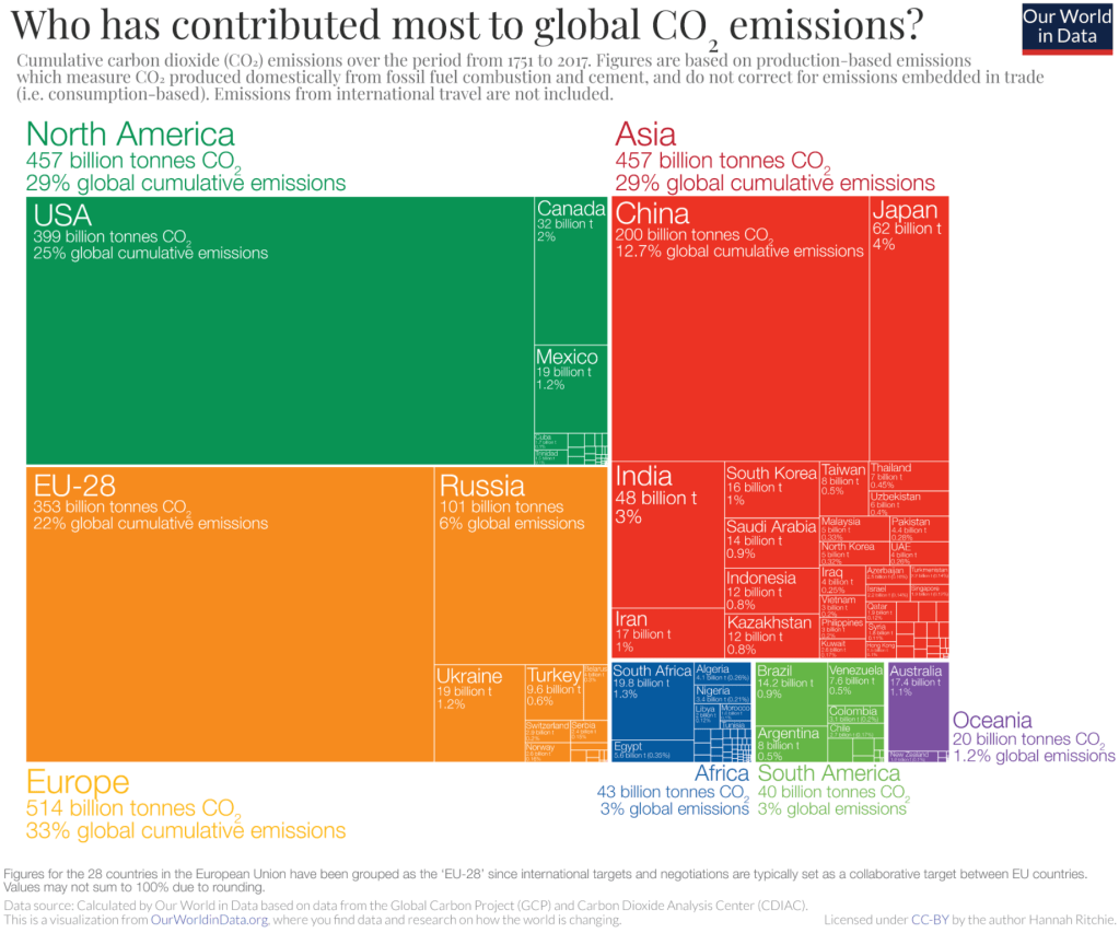 The figure below illustrates countries’ and regions’ historic (1751-2017) emissions of CO2. The US alone accounts for 25% of the historic emissions, the 28 nations of the European Union account for 22% and China 12.7%. India, one of the current top 5 emitting nations accounts for just 3% of historic emissions. All the nations of Africa and South America COMBINED account for just 6% of historical emissions.